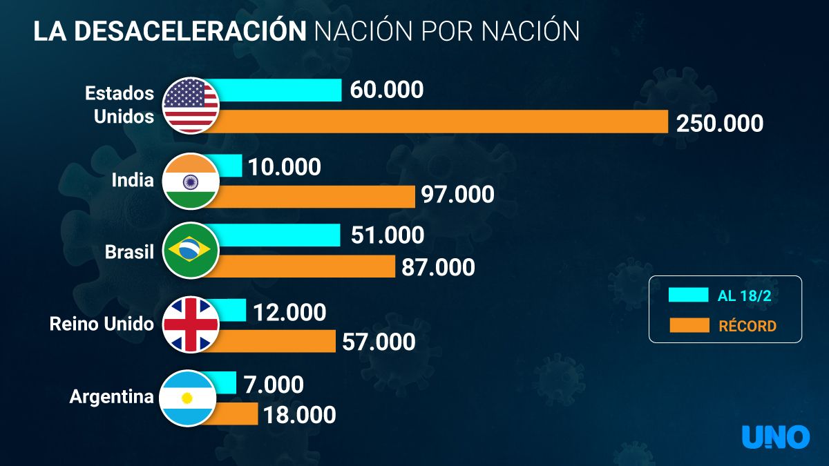 Los países que centran la atención son los que padecieron la peor cara de la pandemia. Estados Unidos llegó a contar 250 mil contagios diarios pero el pasado domingo no superaba los 65 mil. En India ocurre algo similar: alarmó al mundo entero con casi 100 mil casos por día a mediados de septiembre y este jueves apenas superó los 10 mil.