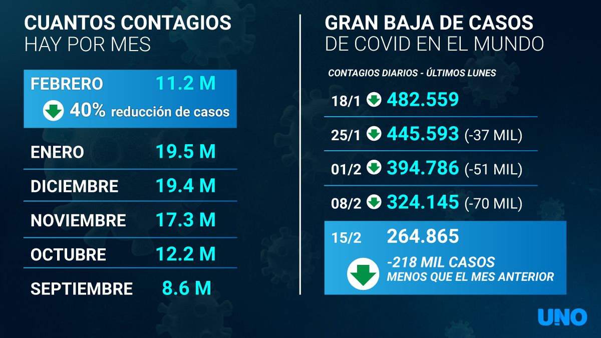 Los números que confirman el descenso de casos, más allá de algunas subas esta semana, se hacen visibles de distintas maneras. Mientras en el mundo el tercer lunes de enero hubo casi medio millón de contagiados en 24 horas, el tercer lunes de febrero se registraron 264 mil. Cerca de la mitad.