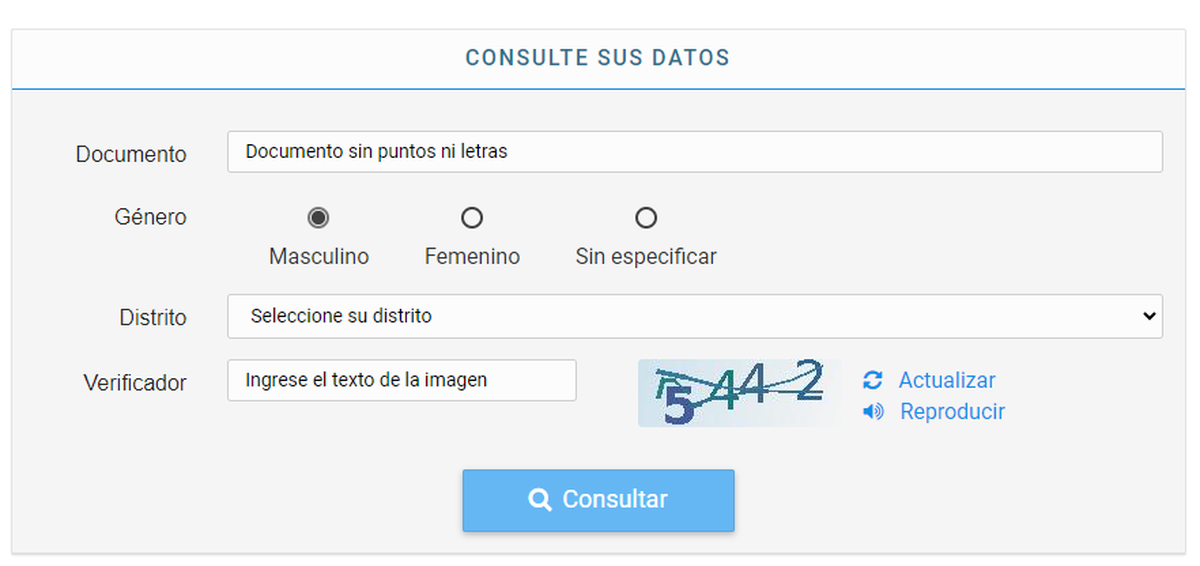 Para ello, el elector debe introducir en el sistema su número de documento, género, distrito donde vota e ingresar un código verificador. A partir de esos datos, el ciudadano conocerá el establecimiento y la mesa en que debe sufragar, incluso puede conocer a través de Google Maps para conocer el cómo llegar al lugar.
