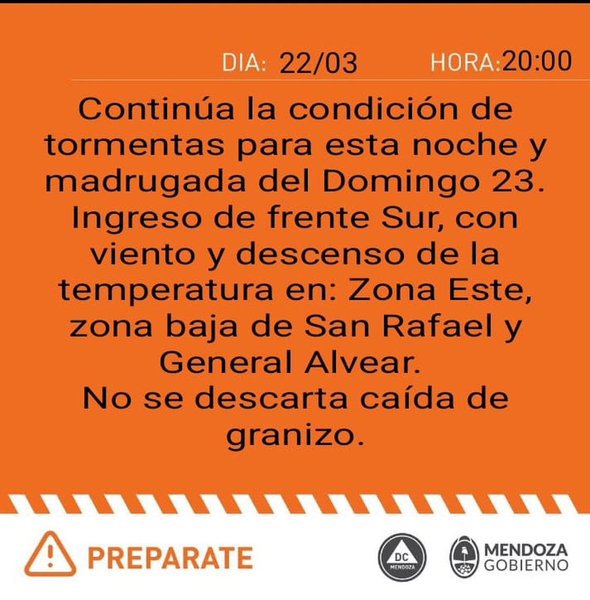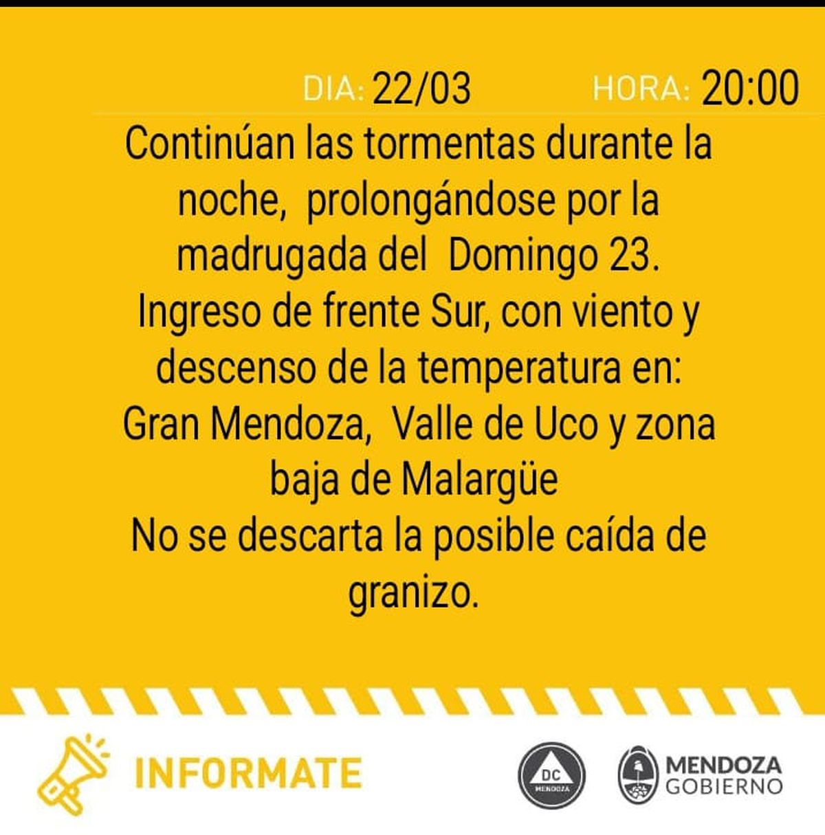 Además, desde la Dirección de Contingencias Climáticas se emitió un alerta amarillo por tomentas, con caída de granizo, durante esta madrugada para el Gran Mendoza. Estos eventos se producirán por el ingreso de un frente frío.
