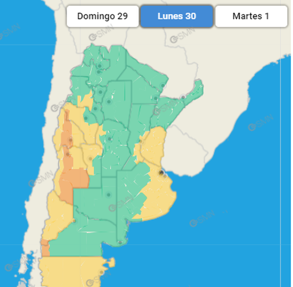 El servicio Meteorológico Nacional (SMN) emitió alertas amarilla y naranja por viento Zonda para la noche de este domingo y durante toda la jornada del lunes para los departamentos del Gran Mendoza, el Valle de Uco y gran parte del Sur provincial.