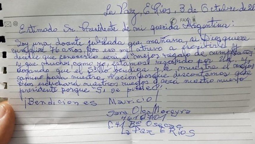 “Estimado Sr. Presidente de mi querida Argentina: Soy una docente jubilada que mañana, si Dios quiere, cumpliré 76 años, por eso me atrevo a escribirle y decirle que conocerlo será el “mejor regalo de cumpleaños” y que muchos, como yo, estamos rezando por Ud. y rogando que el Sr. lo bendiga y le muestre el mejor camino para nuestra Nación porque descontamos que Dios escuchará nuestros ruegos y será nuestro nuevo presidente porque “Sí se puede”. ¡Bendiciones Mauricio! Sara Olga Moreyra C. 41 Bº Osecac La Paz E. Ríos“, redactó Moreyra.