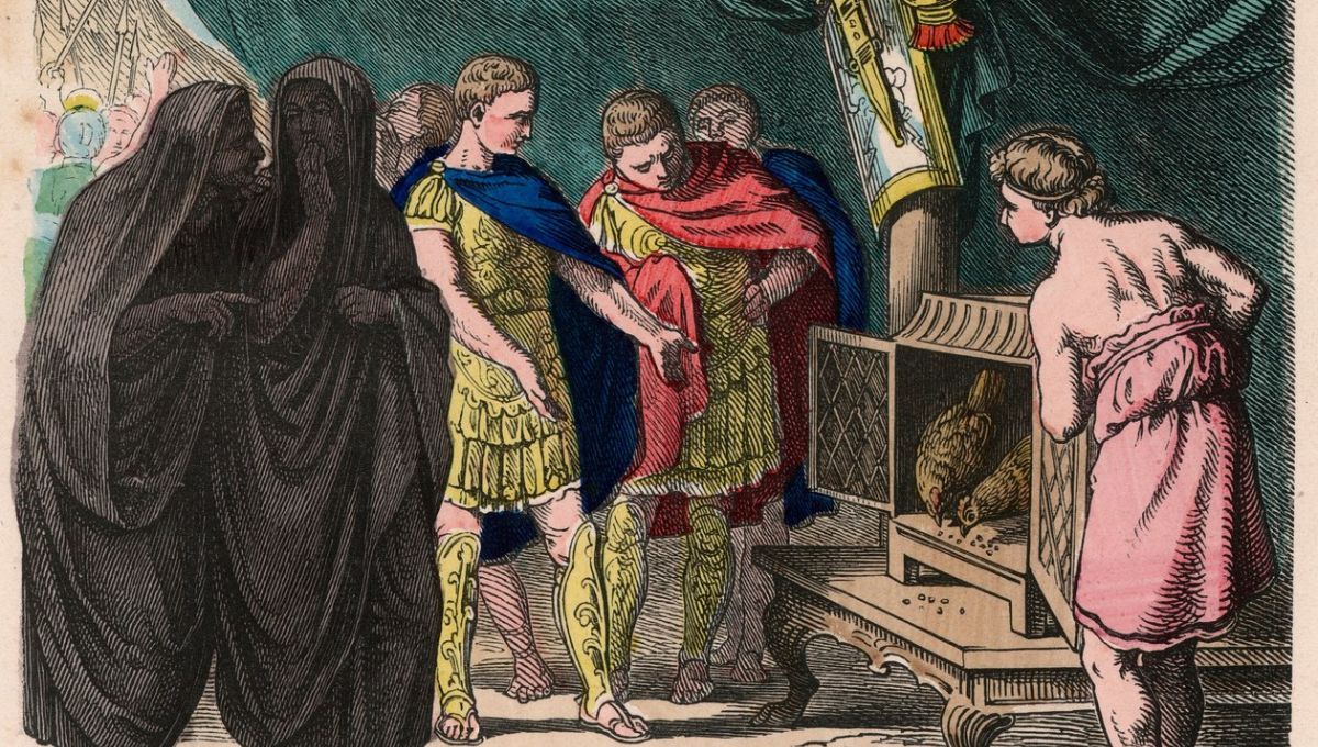 Según explica World History la Primera Guerra Púnica (264-241 a.C.), hubo varios presagios y eventos que se interpretaron como señales divinas. Uno de los más conocidos es el incidente de los pollos sagrados, donde el comandante romano Publio Claudio Pulcro, frustrado porque los pollos no comían antes de una batalla naval, los arrojó al mar, lo que fue considerado un mal augurio.