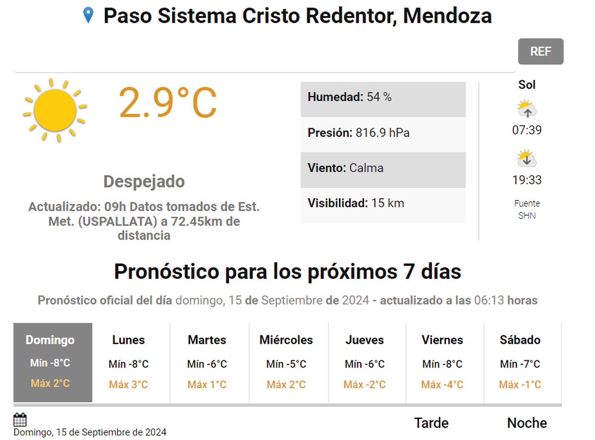 El Sistema Meteorológico Nacional informó el pronóstico para los próximos 7 días en el Paso Cristo Redentor. Este domingo se esperaba una máxima de 2 grados y una mínima de 8 bajo cero.