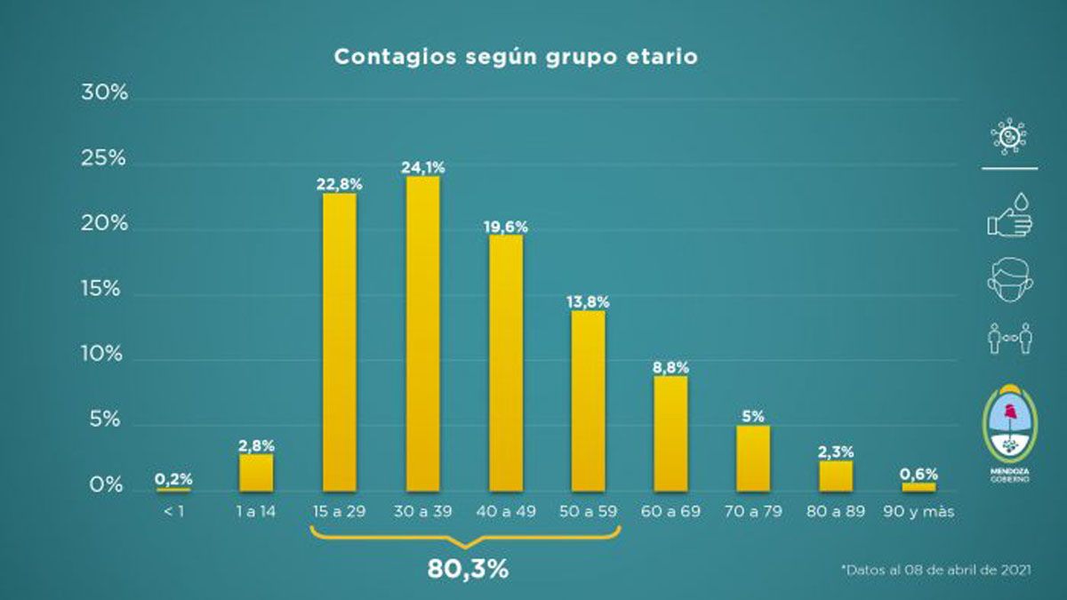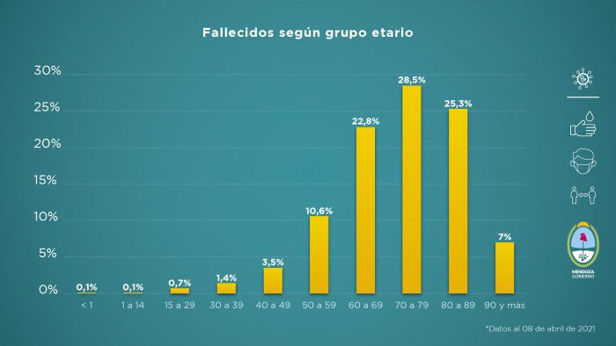 Asimismo, el grupo etario más vulnerable frente a la enfermedad sigue siendo el de los adultos mayores. El 76,6% de los fallecidos tiene entre 60 años y 89 años y las personas de más de 90 años representa el 7%.
