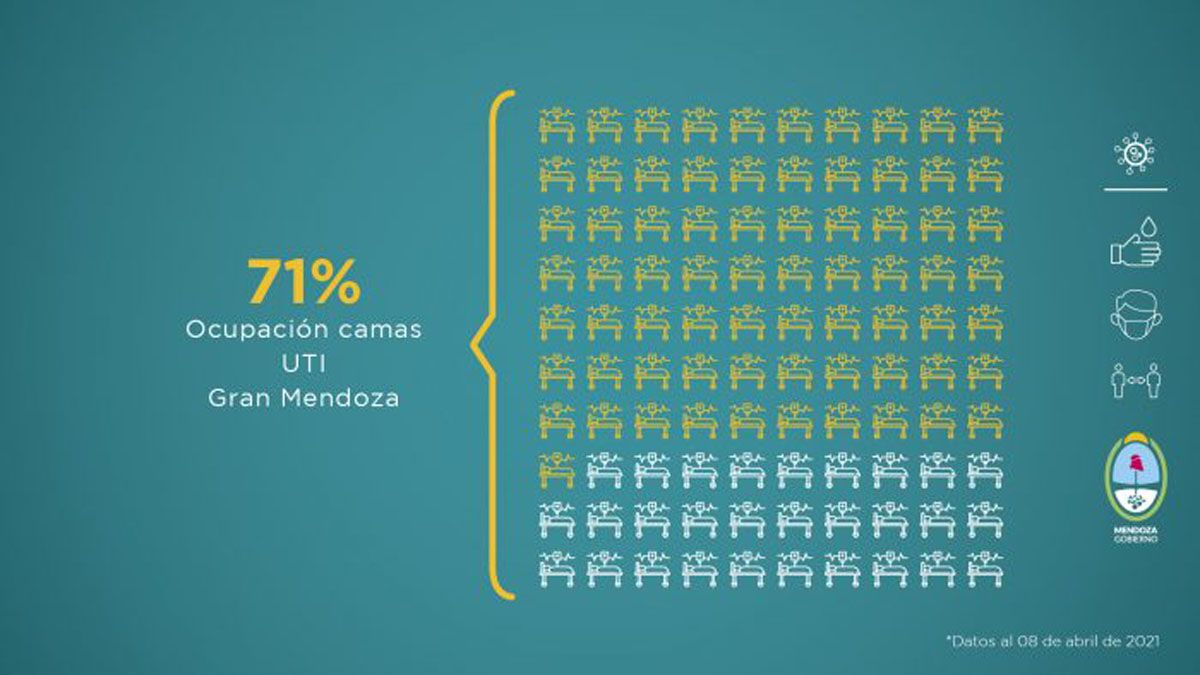 En cuanto al factor ocupacional de camas de terapia intensiva, en el Gran Mendoza es del 71% y el 65,1% en todo el territorio mendocino.