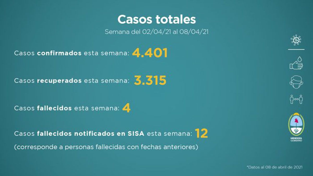 En cuanto a la cantidad de casos de Covid-19 en la semana del del 2 al 8 de abril es de 4.401 confirmados, 3.315 recuperados, 4 fallecidos y 12 casos fallecidos notificados en SISA esta semana (corresponde a personas fallecidas con fechas anteriores).