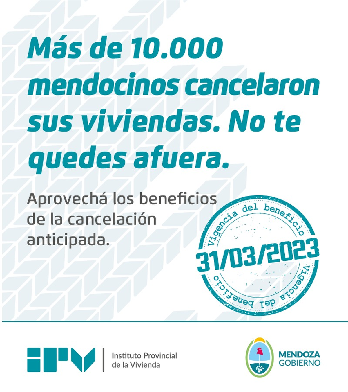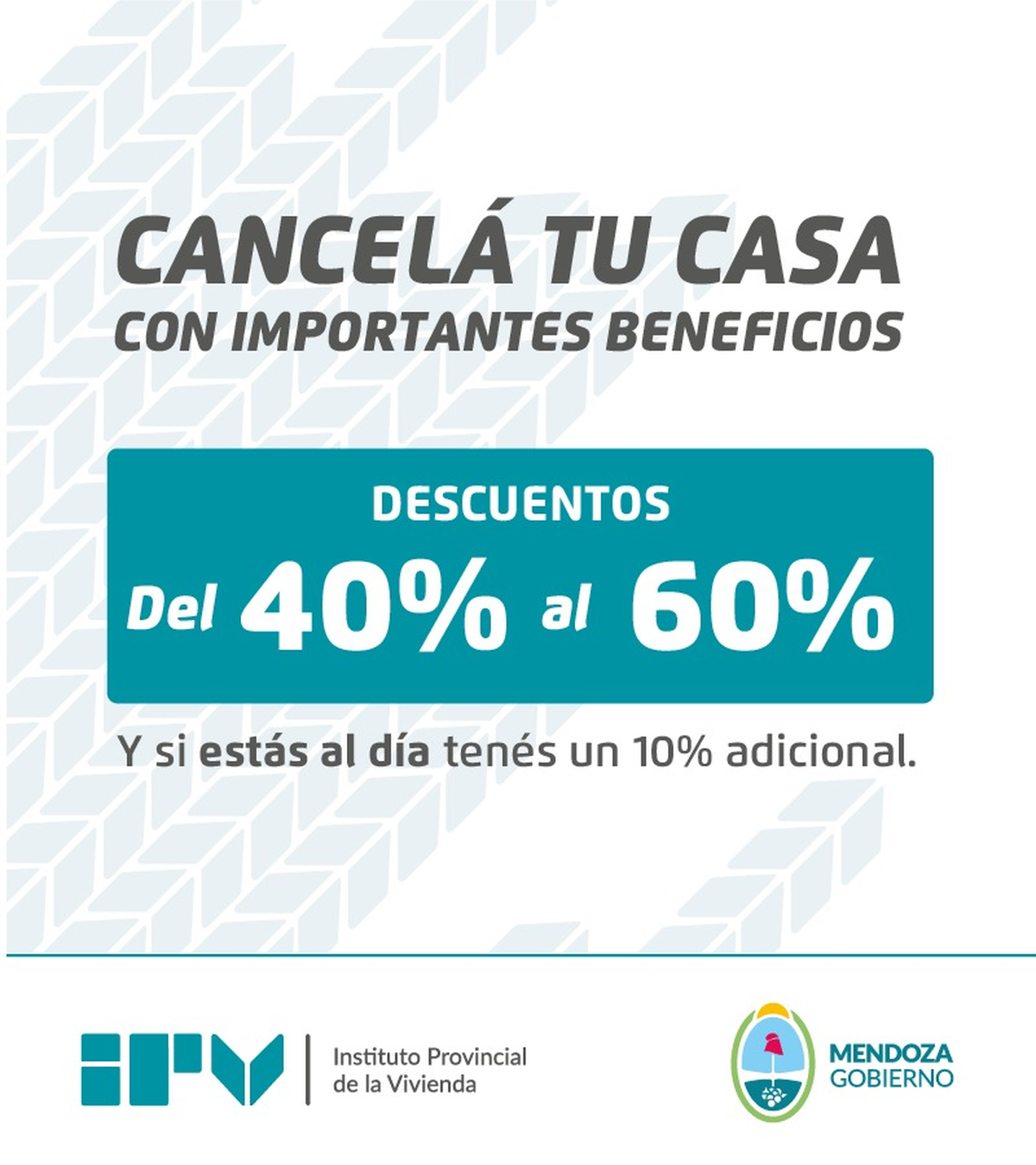 Cabe aclarar que estos beneficios estarán vigentes hasta el 31 de marzo según lo establece la norma, si bien desde el IPV se está analizando la posibilidad de prorrogar este vencimiento. Y que quienes no estén alcanzados por la ley, igualmente pueden cancelar con un descuento del 20%.