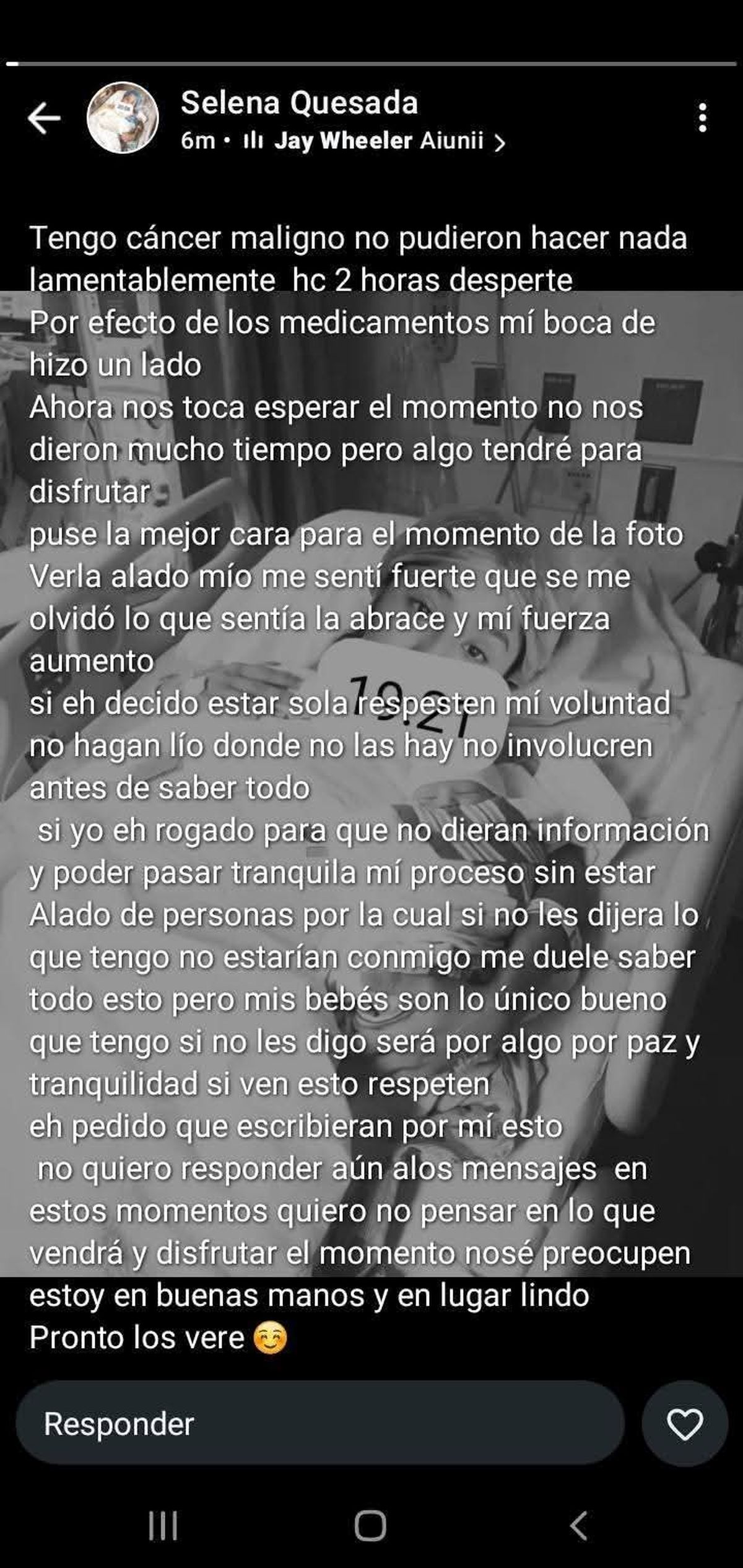"Tengo cáncer maligno, no pudieron hacer nada lamentablemente. Hace dos horas desperté por efecto de los medicamentos", comenzó el posteo.
