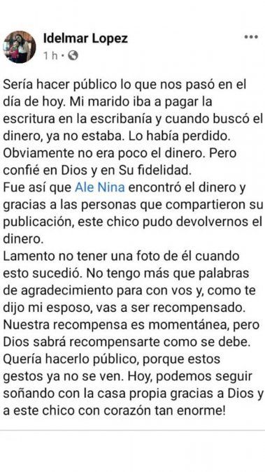Claro, hubo algunos que dijeron haber perdido plata pero no concordaba el monto ni la descripción de como habían sido encontrados hasta que, al tiempo t después de que el posteo se replicara decenas de veces, apareció la pareja de quien había extraviado el dinero y fue a buscarlo a casa de Ale.