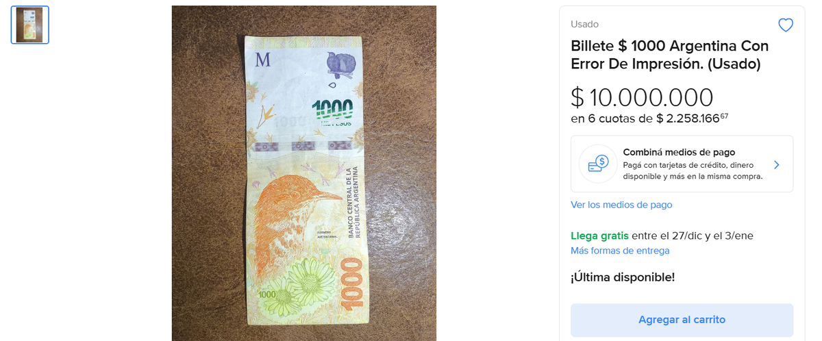 Justamente, los errores de impresión son algunas de las características que pueden hacer que una moneda o un billete sea muy valioso. También su antigüedad, el hecho de que sean pocos los impresos, un particular número de serie u otro detalle, son otras de las cualidades que puede poseer uno de estos ejemplares y que hacen que su dueño pueda ganar mucho dinero, como es el caso de este billete de $1000 que se vende por Mercado Libre.
