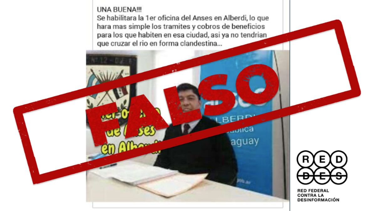 Circula en Facebook, Twitter y Whatsapp una imagen con una texto que indica: “UNA BUENA!!! Se habilitara la 1 er oficina del Anses en Alberdi, lo que hara mas simple los tramites y cobros de beneficios para los que habiten en esa ciudad, asi ya no tendran que cruzar el río de forma clandestina…” (sic). Esto es falso. No se abrió ninguna oficina de la Administración Nacional de la Seguridad Social (ANSES) en Alberdi, localidad paraguaya del departamento de Ñeembucú, ubicada frente a la ciudad argentina de Formosa.