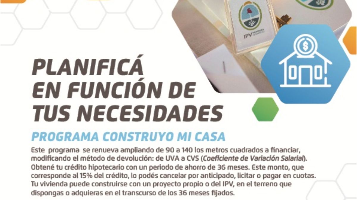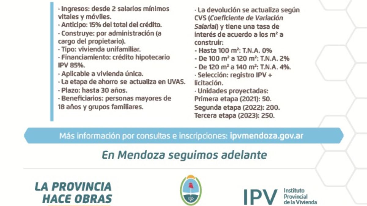 La inscripción a Construyo mi Casa se realiza online, ingresando a la web del IPV www.ipvmendoza.gov.ar. Una vez ahí, los interesados podrán descargar la documentación requerida, la guía para completar la inscripción y los montos vigentes por categoría.