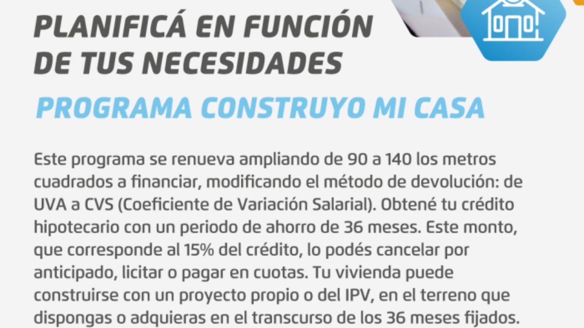 (Editado por Raúl Adriazola) Desde el Gobierno de la provincia hicieron el anuncio de la apertura para la inscripción en el Programa Construyo Mi Casa. Con esta línea, el Instituto Provincial de la Vivienda (IPV) brinda la posibilidad de acceder a un crédito hipotecario que posibilite la construcción o terminación de una vivienda, en el terreno que disponga el beneficiario, luego de haber cumplido con un periodo de ahorro. La inscripción a uno de los tres nuevos programas habitacionales está destinada a personas solas o familias que deseen construir su casa.
