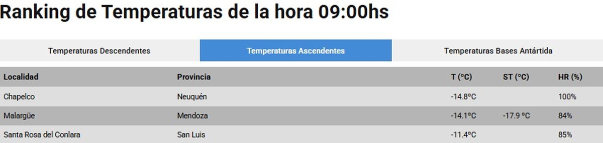 Mucas provincias se encuentran con temperaturas extremadamente bajas este lunes 30 de junio debido a la ola polar. El Servicio Meteorológico Nacional comparte un ranking de temperaturas en el que se puede observar cuál es la más fría en este momento.