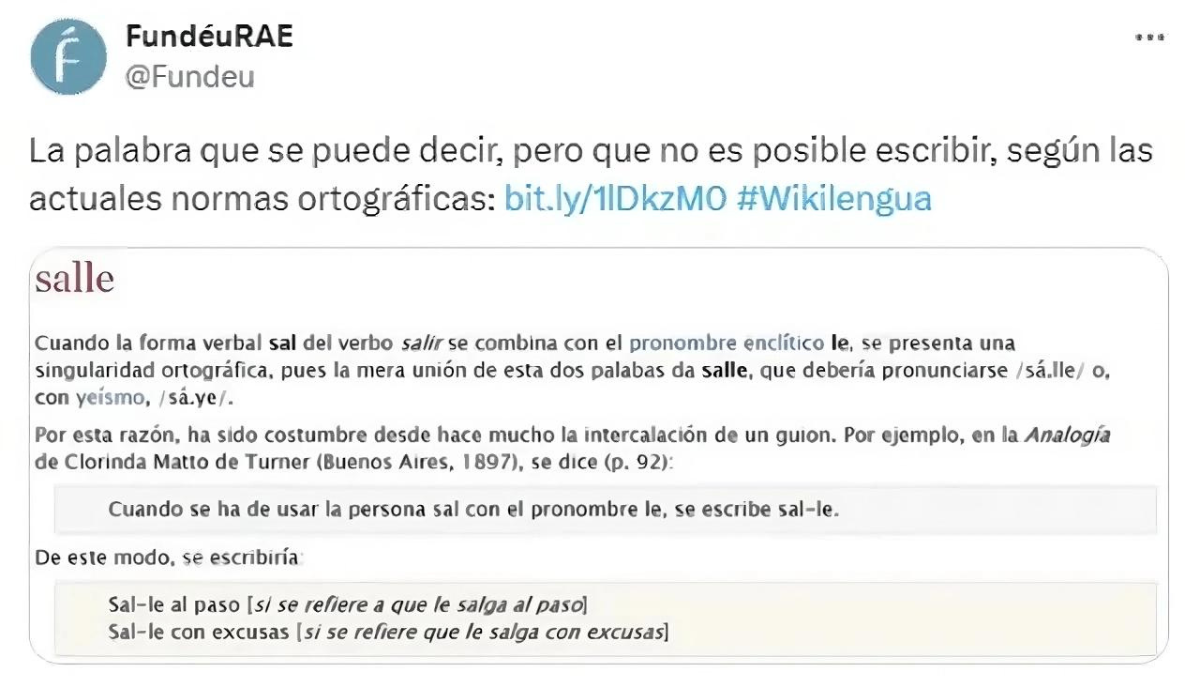La Real Academia Española (RAE) aclaró a través de un tweet que la palabra en cuestión es el imperativo del verbo "salir" combinado con el pronombre enclítico "le". Los ejemplos proporcionados por la RAE son: