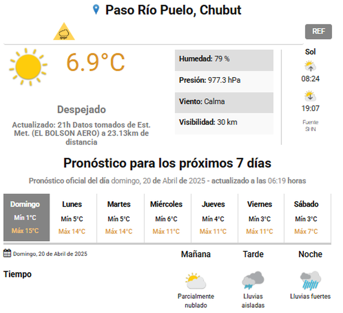 El Servicio Meteorológico Nacional emitió un alerta en las provincias de Chubut y Río Negro. El área será afectada por lluvias persistentes, de intensidad moderada a localmente fuerte. Se estiman valores de precipitación acumulada entre 10 y 30 mm, pudiendo ser superados de manera puntual. No se descarta que en las zonas cordilleranas más elevadas la precipitación se presente en forma de lluvia y nieve.