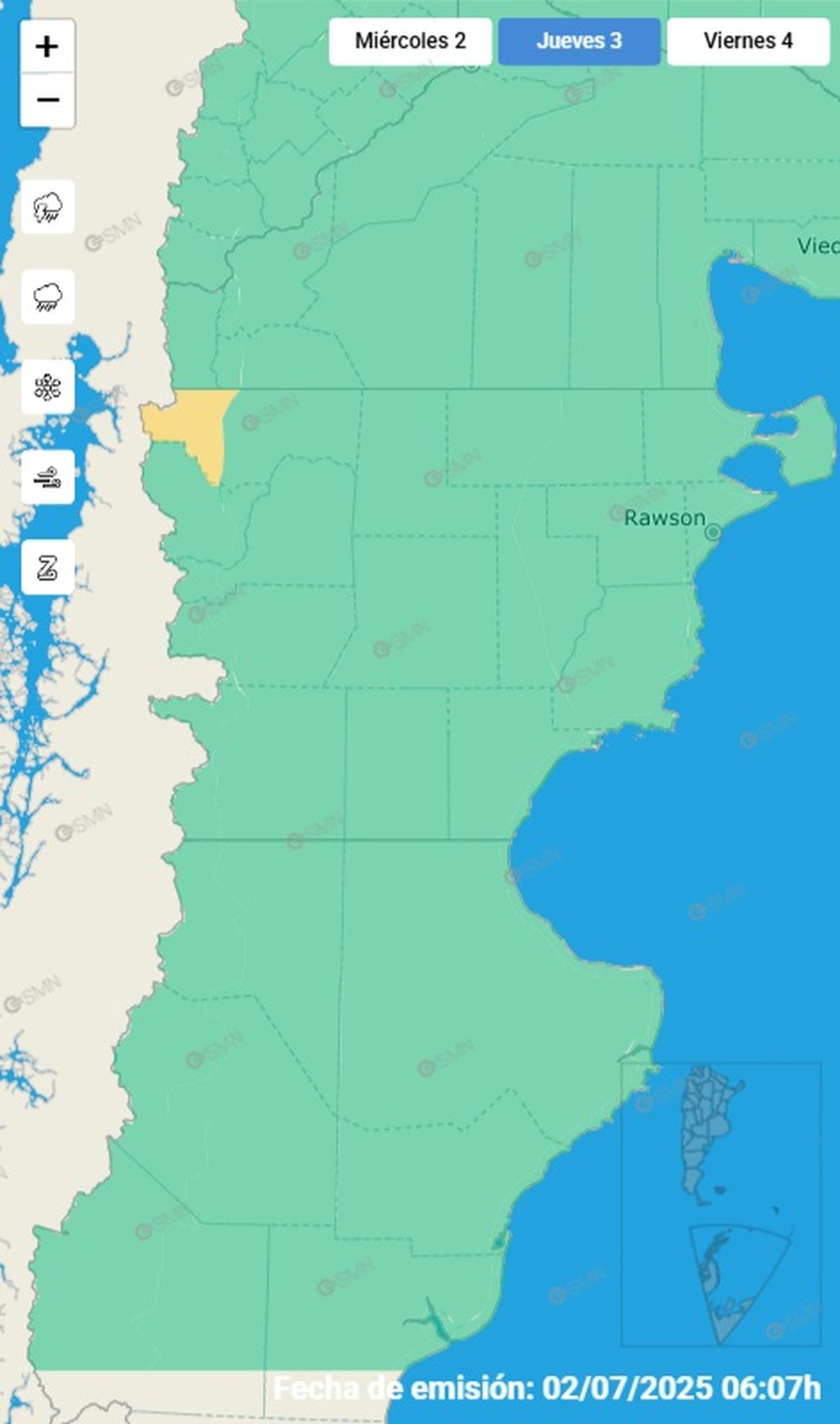 El Servicio Meteorológico Nacional emitió un alerta por la llegada de fuertes lluvias a la provincia de Chubut este miércoles 2 de julio. El área será afectada por lluvias persistentes de variada intensidad. Se estiman valores de precipitación acumulada entre 15 y 30 mm, pudiendo ser superados de manera puntual. Los mayores valores de precipitación acumulada se esperan en las zonas más elevadas en donde, además, no se descarta la ocurrencia de lluvia y nieve.