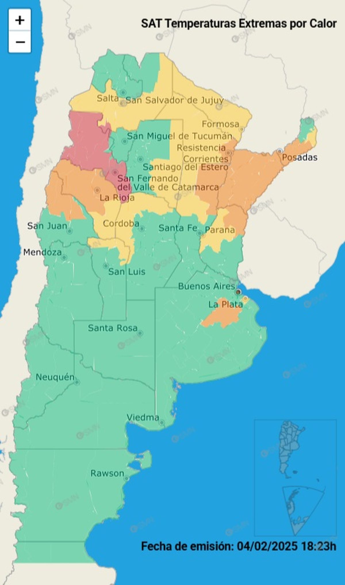 Las provincias que se encuentran en alerta naranja son Corriente, Misiones, Chaco, Entre Ríos, Santa Fe, Buenos Aires, La Rioja y San Juan. En alerta amarilla se encuentran Formosa, Salta, Santiago del Estero, Chaco, Parte de Córdoba, Santa Fe, Entre Ríos y San Luis.