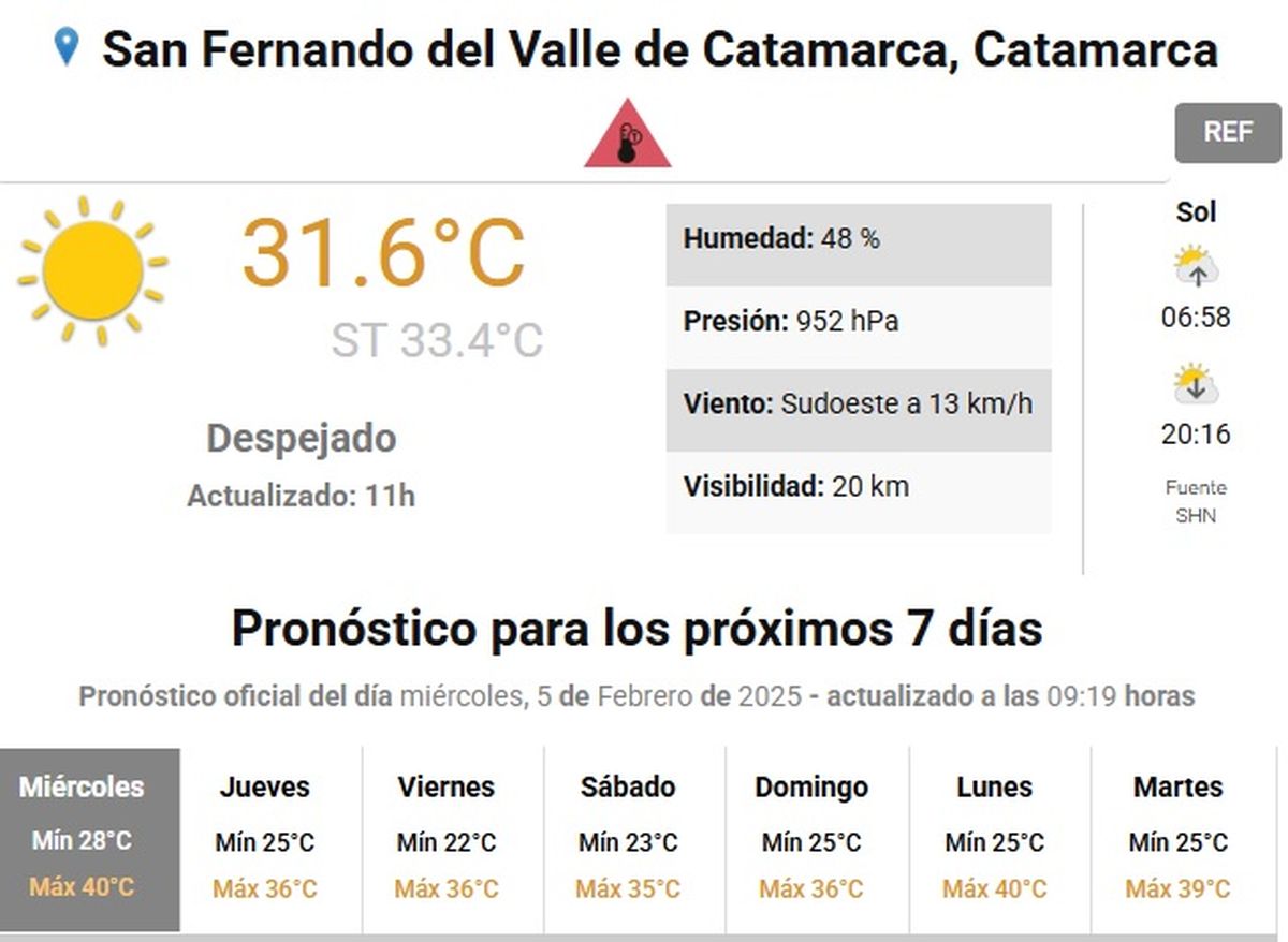 El Servicio Nacional de Meteorología emitió un alerta rojo para la provincia de Catamarca debido a que tendrá temperaturas extremadamente altas. Las temperaturas rondarán alrededor de los 40 °C.
