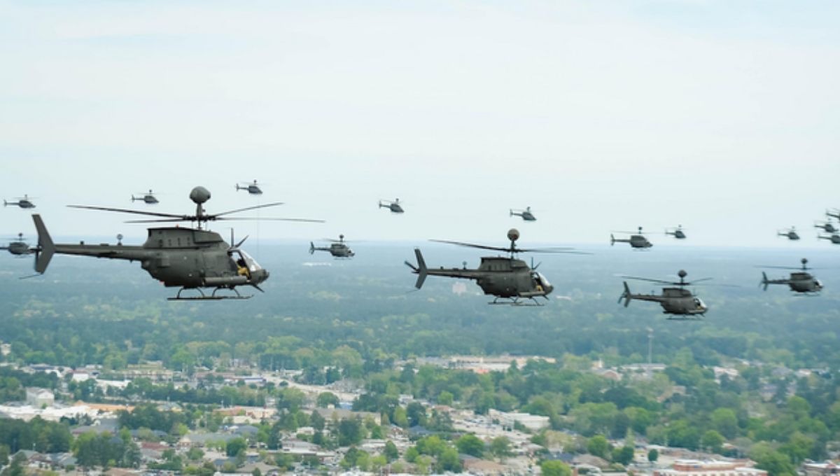 Este vuelo no fue un simple ejercicio. Representó un récord mundial oficialmente reconocido por Guinness World Records, marcando la mayor formación de helicópteros en la historia. Cada máquina, un Bell OH58D Kiowa Warrior, avanzaba con exactitud milimétrica, casi rozando la sincronía de un reloj suizo, mientras los pilotos, entrenados durante años, coordinaban cada giro, cada ascenso y descenso, con una disciplina impresionante.