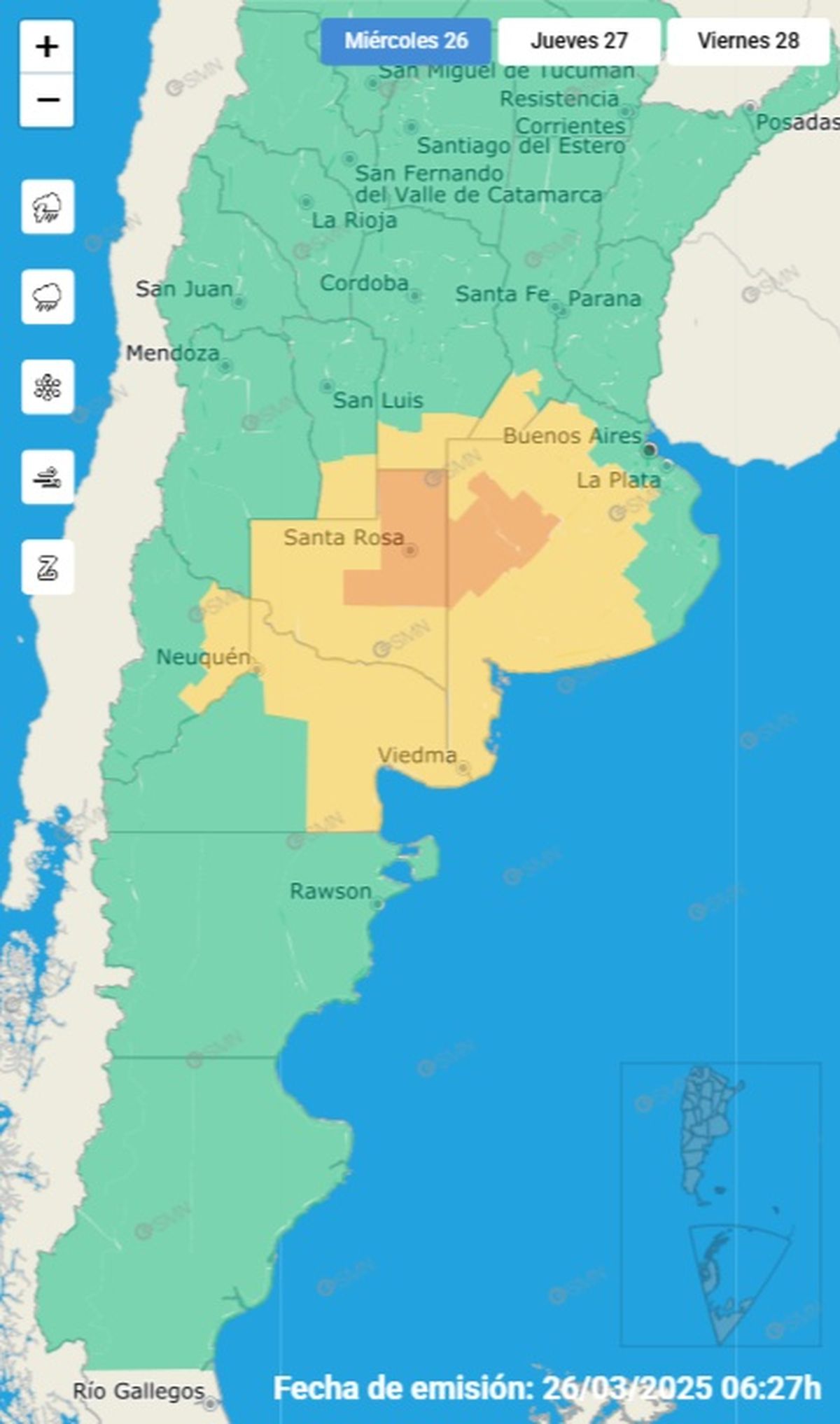 El área será afectada por lluvias y tormentas, algunas fuertes. Las mismas podrán estar acompañadas fundamentalmente por abundante caída de agua en cortos períodos, y eventualmente ráfagas fuertes, granizo, y/o intensa actividad eléctrica. Se prevén valores de precipitación acumulada entre 15 y 40 mm, pudiendo ser superados en forma puntual.