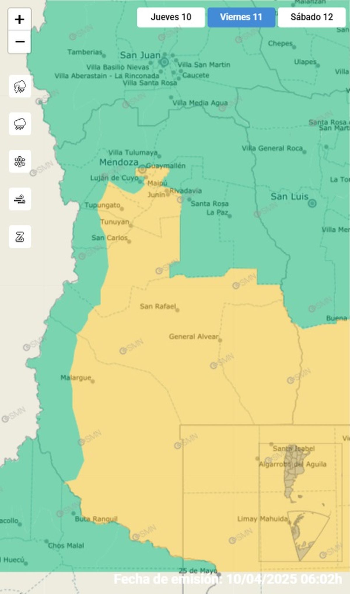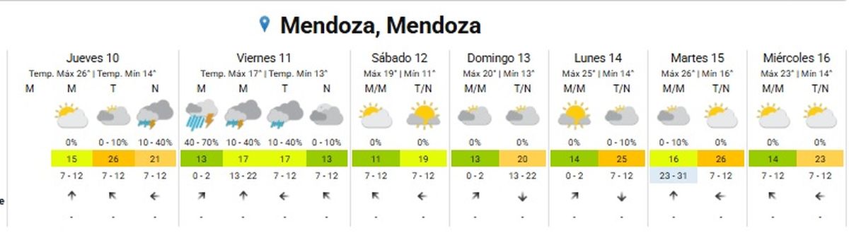 El Servicio Meteorológico Nacional emitió un alerta para la ciudad de Mendoza por la llegada de tormentas con granizo. El área será afectada por tormentas, algunas fuertes. Las mismas podrán estar acompañadas por intensa actividad eléctrica, abundantes lluvias en cortos períodos, granizo y ráfagas de hasta 70 km/h. Se prevén valores de precipitación acumulada entre 15 y 40 mm, que pueden ser superados en forma puntual.