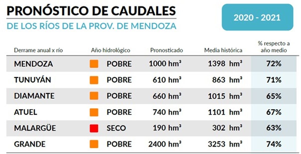 De hecho, se considera que los ríos Mendoza, Tunuyán, Diamante, Atuel y Grande tendrán un año pobre en cuanto a caudal, ya que todos estos presentan disminuciones con respecto a sus valores históricos que van desde casi el 33% al 26%.