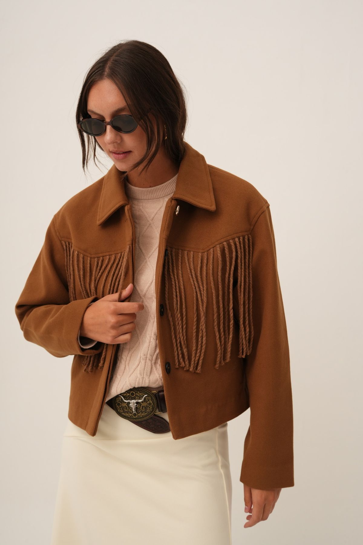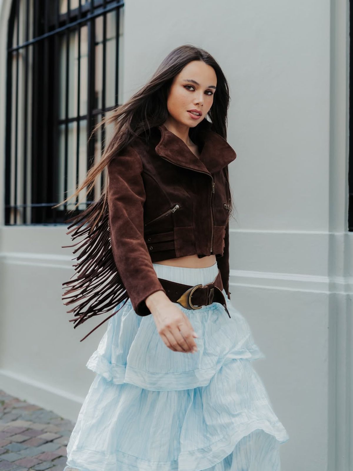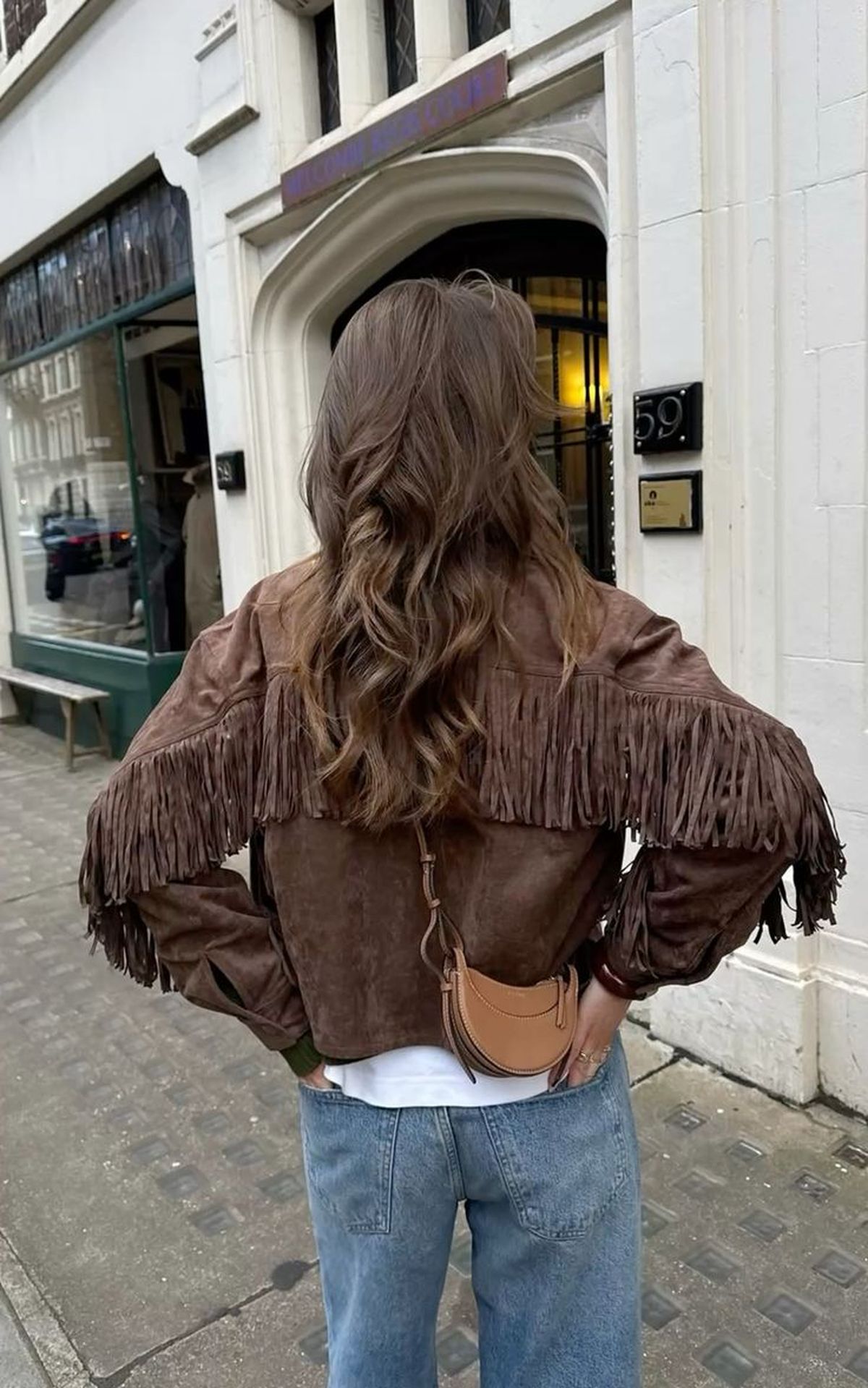 La regla de oro para esta temporada es el equilibrio. Al ser una prenda con mucha personalidad y volumen, la clave está en mantener el resto del conjunto simple. Unos jeans básicos y una remera lisa son suficientes para que la campera con flecos haga todo el trabajo.
