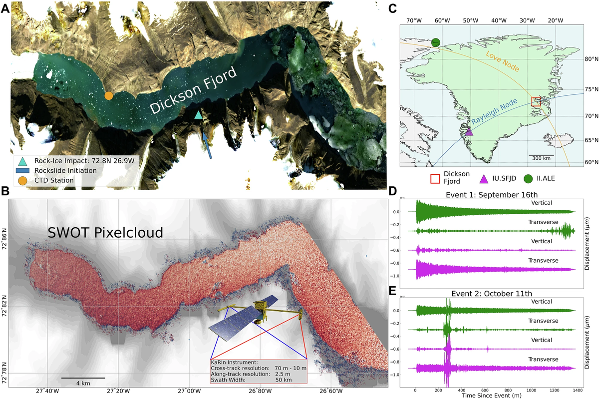 Mediante datos del SWOT, los investigadores confirmaron las olas gigantes en el fiordo. El sismo generado permitió medir niveles de agua con resolución de 2.5 metros a lo largo de 50 kilómetros.