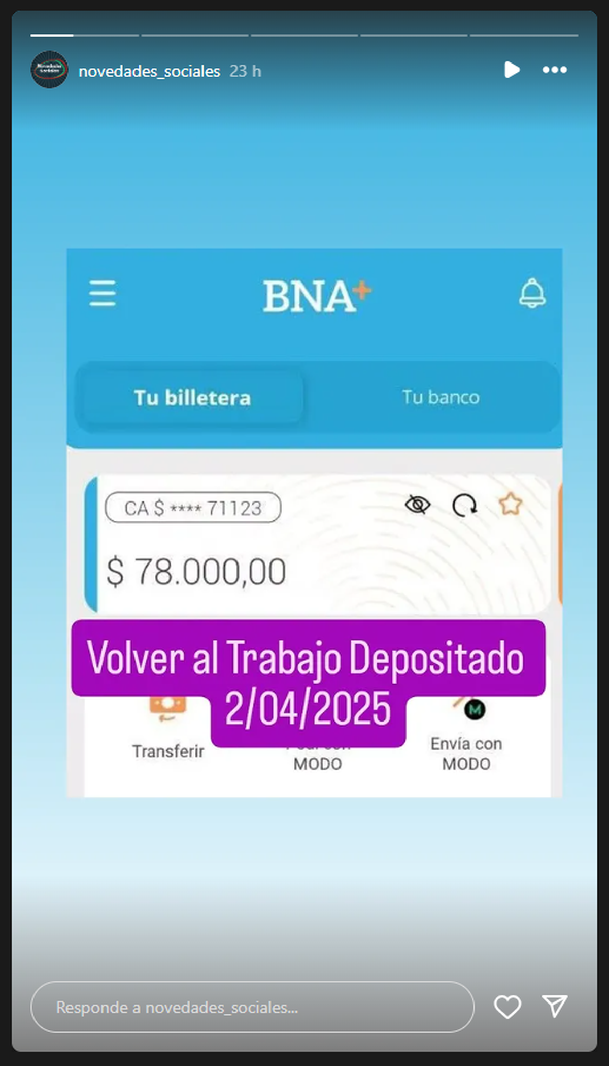 El portal especializado Novedades Sociales mostró en las historias de sus redes el depósito que recibió algún beneficiario, en la imagen de la cuenta se puede ver los $78.000 del ex Potenciar Trabajo y ellos destacan que el mismo se llevó a cabo este miércoles 2 de abril.