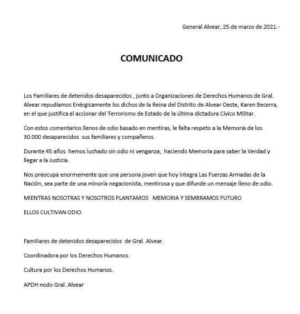 "Los Familiares de detenidos desaparecidos , junto a Organizaciones de Derechos Humanos de General Alvear repudiamos enérgicamente los dichos de la Reina del Distrito de Alvear Oeste, Karen Becerra, en el que justifica el accionar del Terrorismo de Estado de la última dictadura Cívico Militar. Con estos comentarios llenos de odio basado en mentiras, le falta respeto a la Memoria de los 30.000 desaparecidos sus familiares y compañeros» expresaron en un duro comunicado", dice parta de un comunicado difundido por organismos de Derechos Humanos de Mendoza.