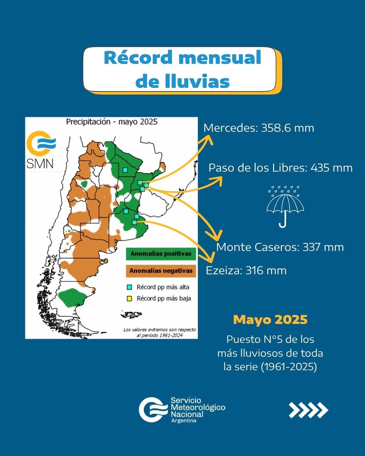 En cuanto a las precipitaciones, el mes de mayo de 2025 en las ciudades de Mercedes, Paso de los Libres, Monte Caseros y Ezeiza ocupó el puesto número 5 de los más lluviosos desde 1961.