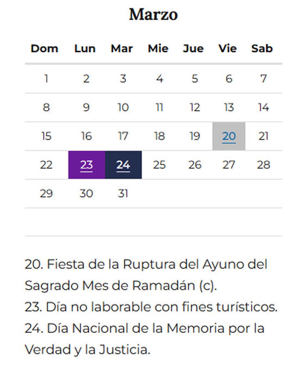 Este descanso extendido se debe a la conmemoración del Día Nacional de la Memoria por la Verdad y la Justicia (24 de marzo), que este año cae martes. Para incentivar el turismo interno, el Gobierno Nacional dispuso que el lunes 23 de marzo sea día no laborable con fines turísticos.