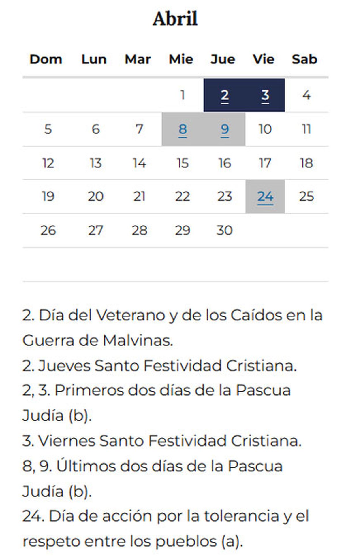 - Del jueves 2 al domingo 5 de abril: se unifican el Día del Veterano y de los Caídos en la Guerra de Malvinas (jueves 2) con el Viernes Santo (3 de abril), conformando otro fin de semana de cuatro días ideal para escapadas.