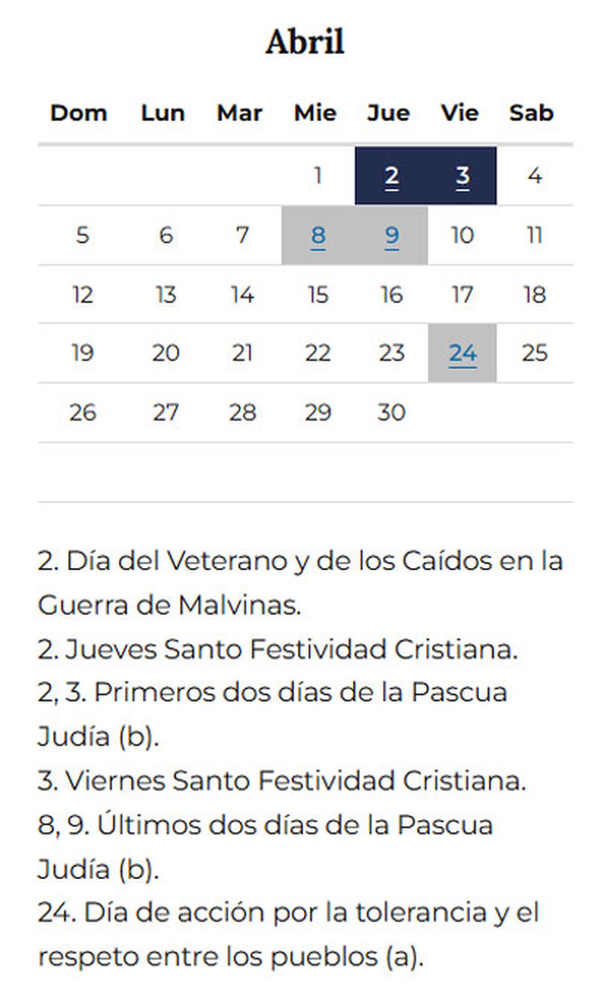 - Jueves 2 de abril: feriado nacional inamovible (Día de Malvinas y Jueves Santo).