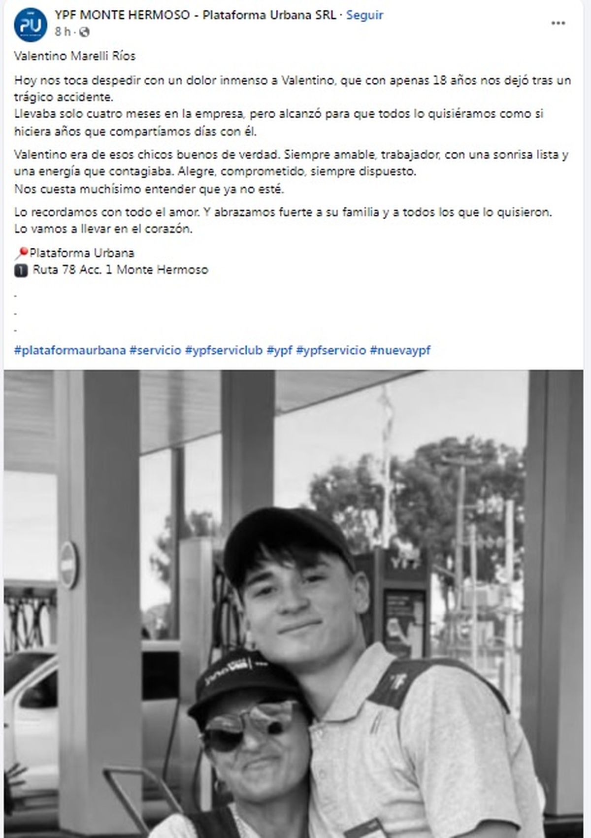 “Hoy nos toca despedir con un dolor inmenso a Valentino, que con apenas 18 años nos dejó tras un trágico accidente. Llevaba solo cuatro meses en la empresa, pero alcanzó para que todos lo quisiéramos como si hiciera años que compartíamos días con él”, comienza el escrito por parte de YPF Monte Hermoso.