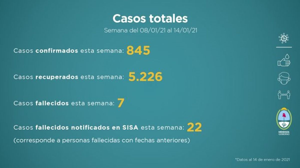 En cuanto a la cantidad de casos de coronavirus en la semana del 8 al 14 de enero, los número son: 845 confirmados, 5.226 recuperados, 7 fallecidos y 22 casos fallecidos notificados en SISA esta semana (corresponde a personas fallecidas con fechas anteriores).