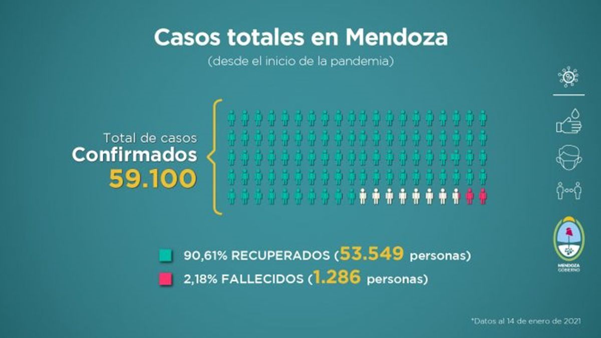 Desde que comenzó la pandemia en Mendoza, las cifras oficiales son: 59.100 confirmados, 53.549 recuperados y 1.286 fallecidos