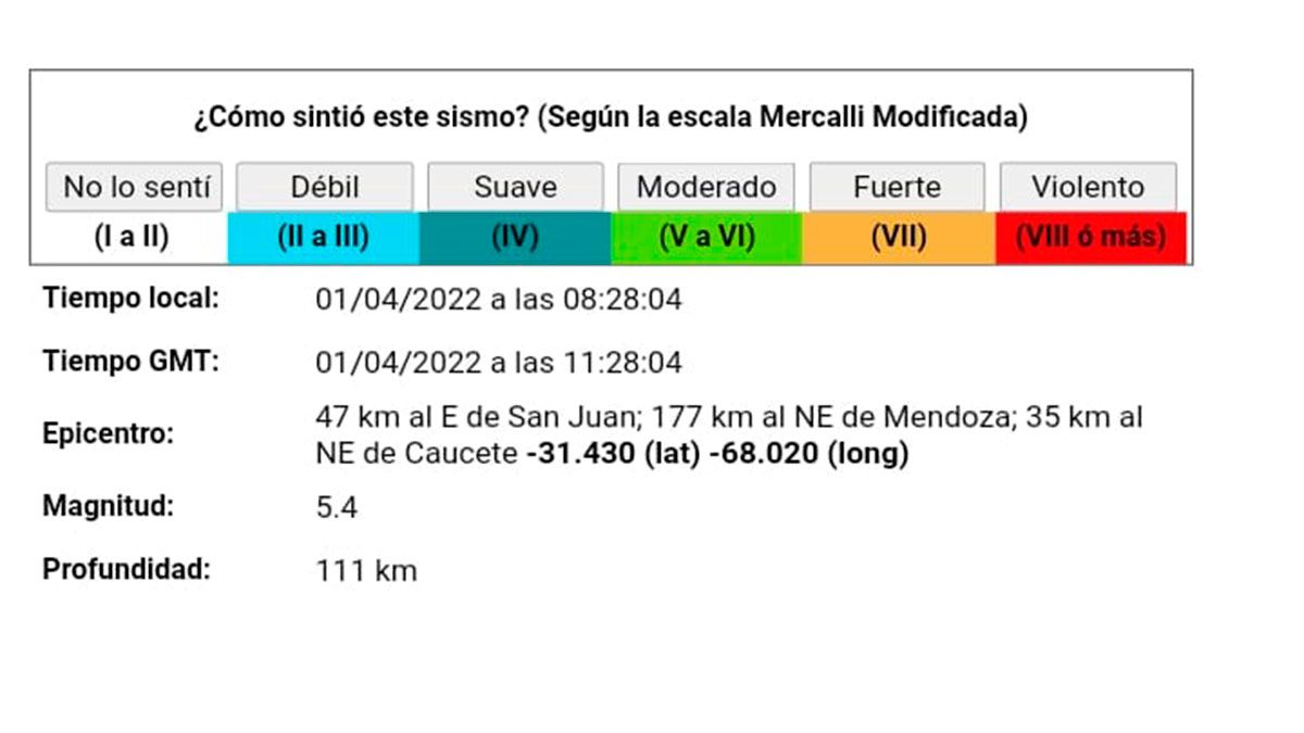 A las 8.28 de este viernes se sintió un fuerte temblor en Mendoza. El epicentro fue en San Juan con una magnitud de 5.4 en la escala de Ritcher y una profundidad de 111 Km, detalló el Instituto Nacional de Prevención Sísimica (Inpres).