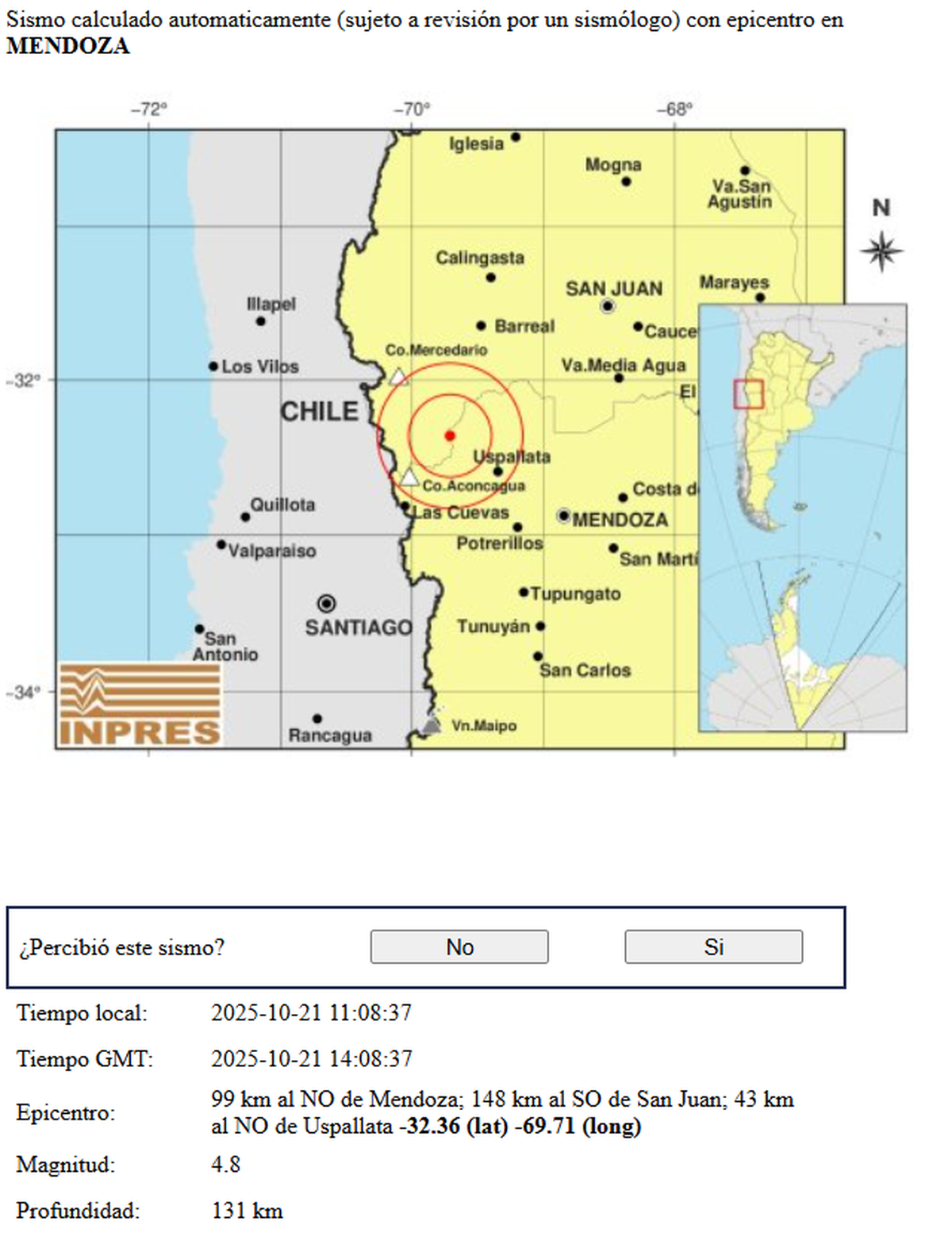 El epicentro, en tanto, se localizó a 43 kilómetros hacia el noroeste de Uspallata, en plena precordillera mendocina. De hecho, vecinos de esa localidad reportaron que el sismo se percibió con intensidad.