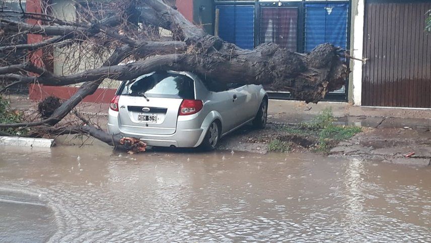 Además, los fuertes vientos provocaron la caída de árboles y también postes de luz, por lo que varios sectores quedaron sin luz eléctrica. Como un árbol paraíso, que cayó encima de un Ford Ka en el distrito La Colonia.