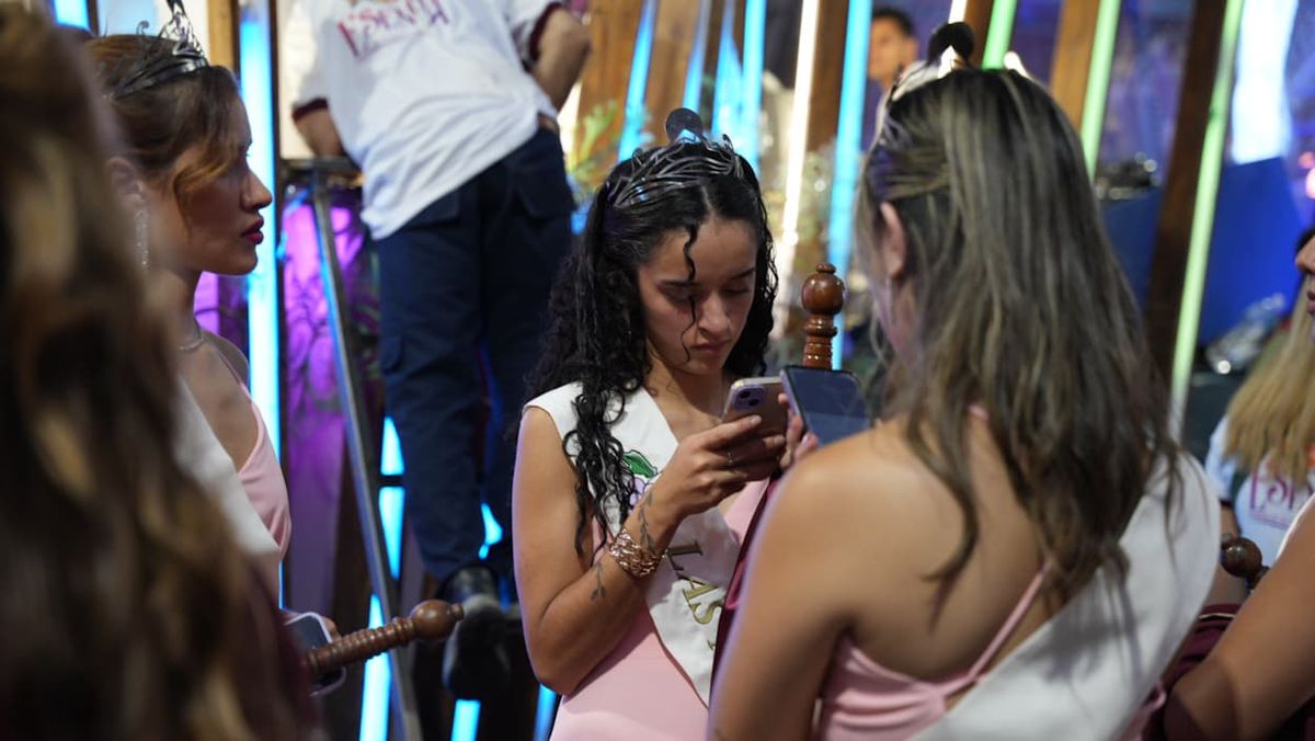 Antes de comenzar a desfilar, las candidatas a la Vendimia 2025 querían registrar todo lo que estaba sucediendo con sus celulares y comunicarse con sus seres queridos.