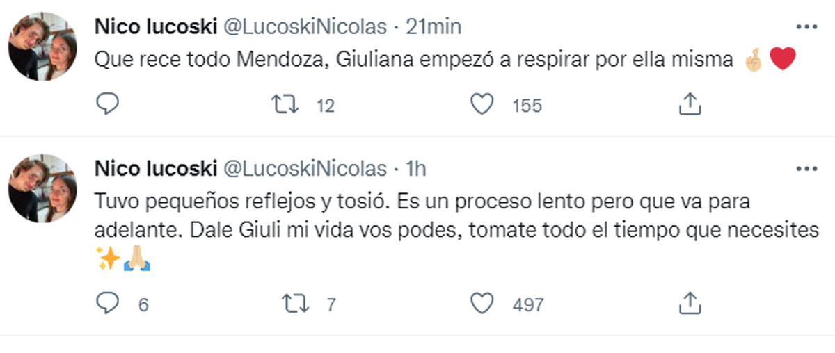 Unos minutos antes el mismo Nicolás había escrito sobre Giuliana que "Tuvo pequeños reflejos y tosió. Es un proceso lento pero que va para adelante. Dale Giuli mi vida vos podés, tomate todo el tiempo que necesites". Se continúa evaluando estrictamente su estado neuronal. Buena evolución de todo el post operatorio traumatológico y abdominal", explica el parte médico oficial