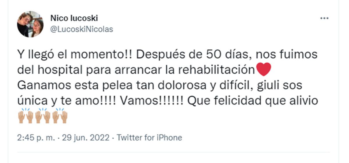 Giuliana Lucoski recibió este miércoles el alta médica. La buena noticia llegó 50 días después del accidente en Luján de Cuyo que la tuvo al borde de la muerte cuando chocó junto a su novio, el médico Ricardo Luna. Así lo informó a través de Twitter el hermano de la joven, Nicolás Lucoski.