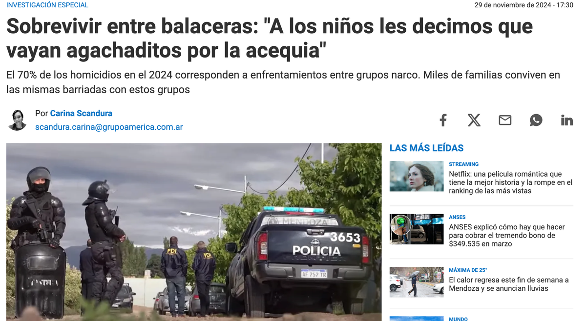 El 27 de noviembre de 2024, el equipo de investigación de Grupo América Interior, presentó el trabajo Sobrevivir entre balaceras. En este informe del segmento Fuente Reservada, que demandó más de un mes de búsqueda de datos, indagación y entrevistas a distintos referentes, jueces, fiscales y hasta ministros nacionales, pudimos presentar por El Siete, radio Nihuil, Diario UNO, y en en el canal de YouTube de El Siete TV, el material terminado con testimonios, casos y cifras de ajustes de cuentas.