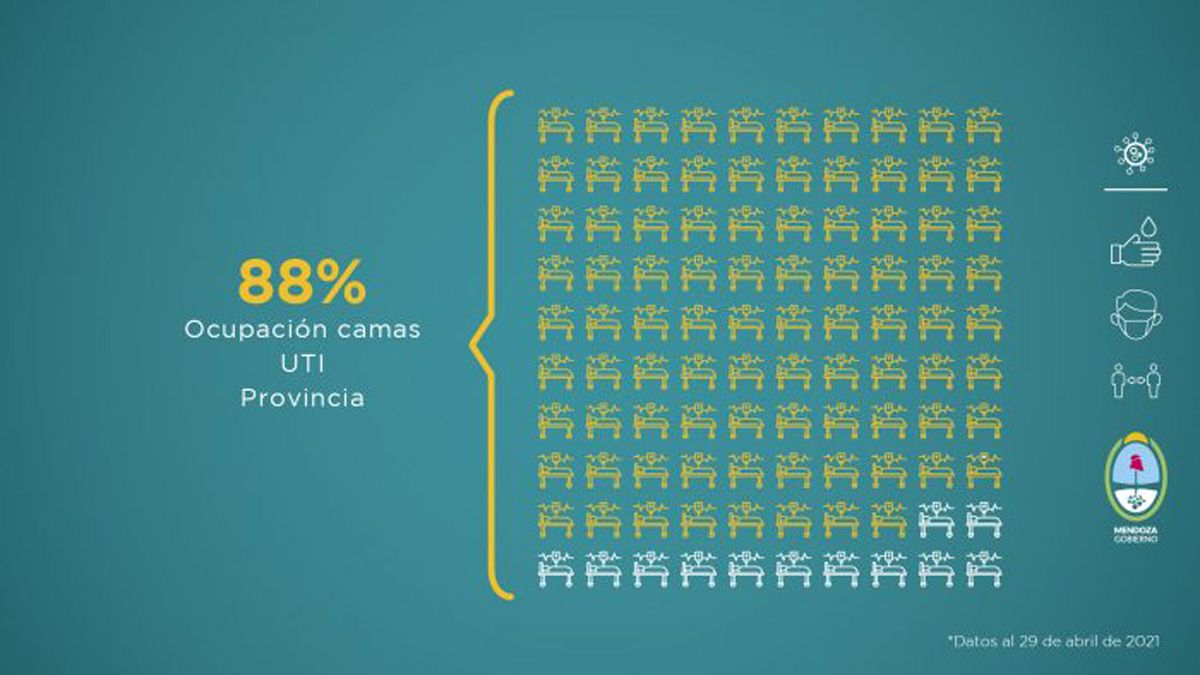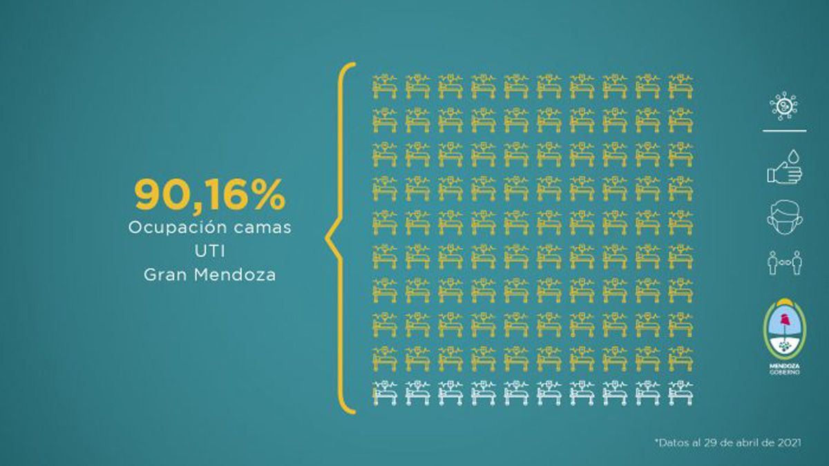En cuanto al factor ocupacional de camas de terapia intensiva, el Gran Mendoza es del 90,16% y el 88% en todo el territorio mendocino. En el informe pasado, esos porcentajes fueron de 91,84% y 88,11% respectivamente.