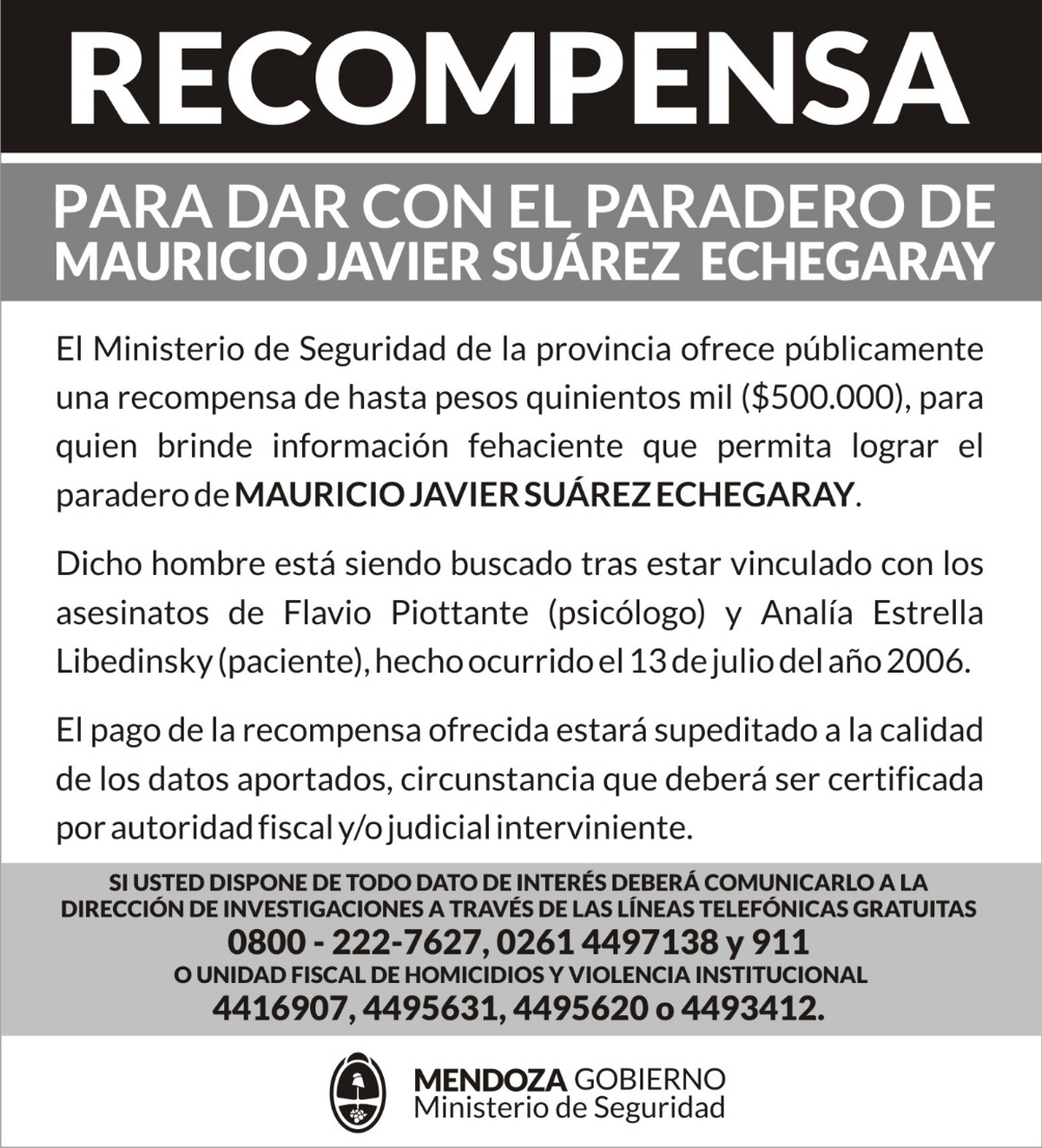 El Ministerio de Seguridad de Mendoza repite la jugada una vez más en el caso Piottante-Libedinsky: ahora renueva su oferta de hasta $500.000 de recompensa para dar con Mauricio Javier Suárez Echegaray, único sospechoso de haber asesinado al psicólogo Flavio Piottante y su paciente Analía Estrella Libedinsky hace 15 años en Ciudad.