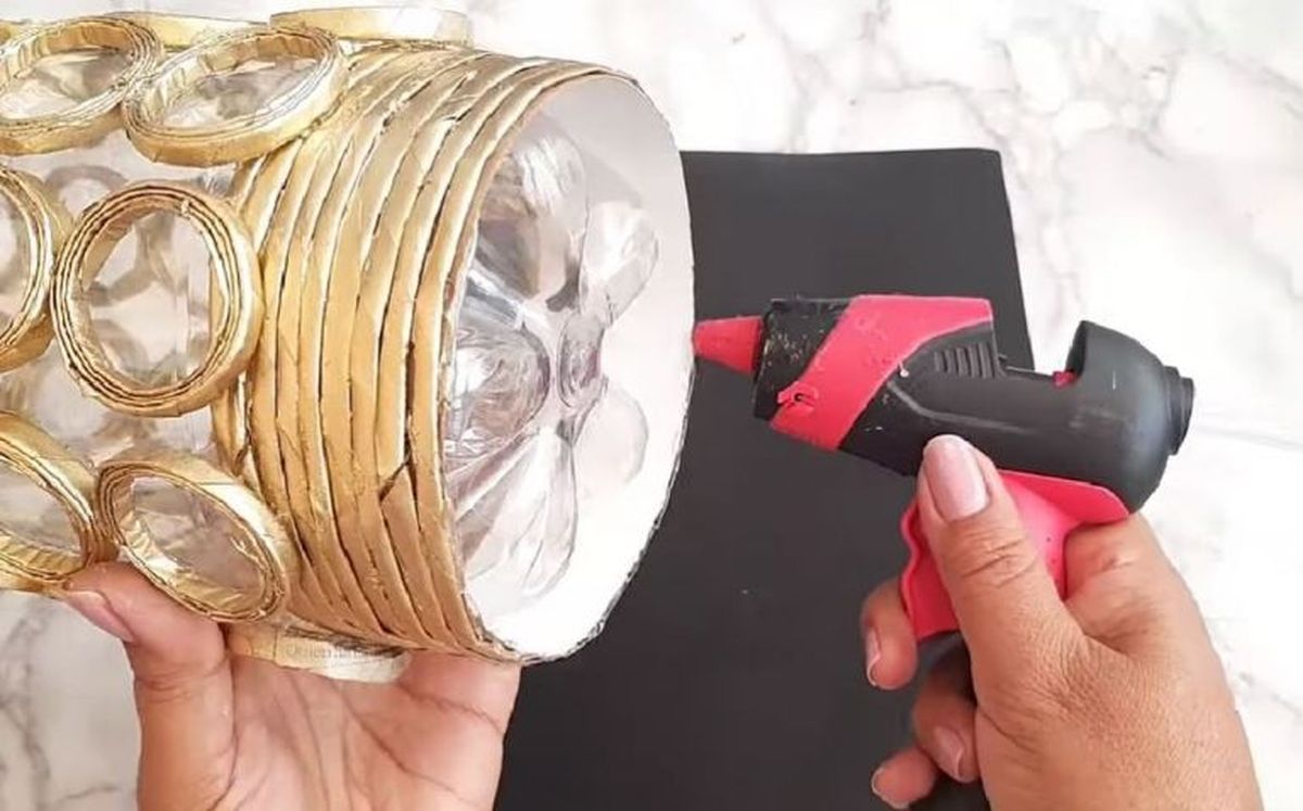 - Corta tiras de periódico de 4 cm de ancho y enróllalas con ayuda de un gancho para tejer. Pégalas entre los giros para que no se despeguen y retira el gancho. Haz 10 tiras de estas y píntalas de dorado. Después, aplánalas y pégalas con la pistolita sobre el cartón que colocaste en la botella.