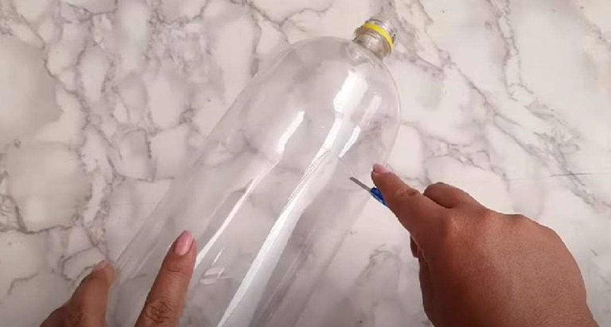 - Lava bien tu botella de plástico y con ayuda de un cúter corta la parte de arriba de la botella.
